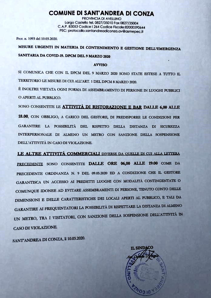 Sant'Andrea di Conza 8 Marzo 2020. Ultimo avviso emanato dl sindaco.... Ottima la risposta di tutti, un elogio