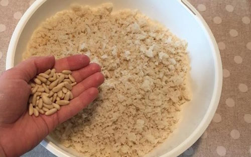 terrina capiente mescolate la mollica di pane con i pinoli. |