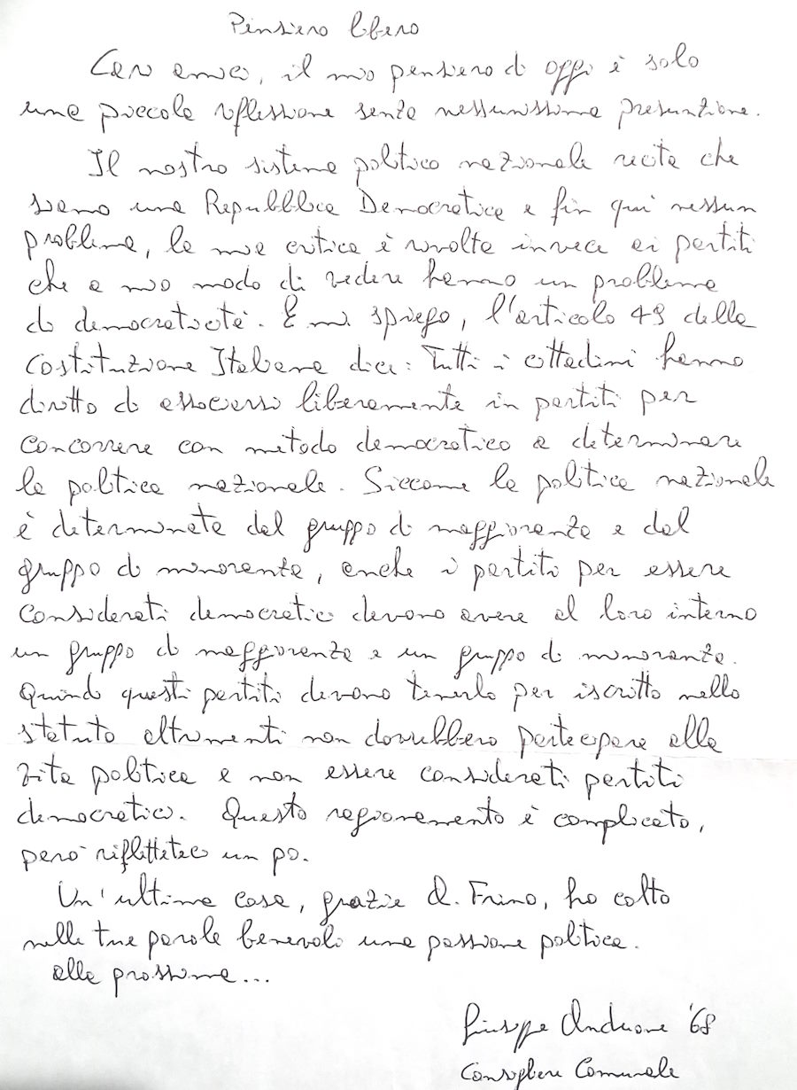 Sant'Andrea di Conza 18 Febbraio 2026. L’autore (Giuseppe Andreone, vicesindaco) esprime un pensiero politico personale, precisando che non ha pretese di originalità o superiorità, ma vuole solo proporre una piccola riflessione.Tesi centrale: La Costituzione italiana (art. 49) garantisce a tutti i cittadini il diritto di associarsi liberamente in partiti per concorrere con metodo democratico a determinare la politica nazionale. Affinché un partito sia davvero democratico, deve rispettare lo stesso principio anche al proprio interno: deve cioè esistere una maggioranza e una minoranza che possano confrontarsi. Questo meccanismo democratico interno dovrebbe essere obbligatoriamente scritto nello statuto del partito. Se un partito non prevede per iscritto maggioranza/minoranza e regole democratiche interne chiare, secondo l’autore non potrebbe essere considerato un partito democratico e non dovrebbe poter partecipare alla vita politica democratica del Paese. L’autore riconosce che il ragionamento è complicato, ma invita a rifletterci un po’. In chiusura ringrazia " Frino" per le parole benevole che hanno riacceso in lui una passione politica, e saluta con «…alle prossime…» In sintesi: Un partito politico nazionale può dirsi democratico solo se applica al proprio interno le stesse regole di democrazia (maggioranza/minoranza) che chiede allo Stato. Altrimenti, secondo l’autore, manca di legittimità democratica profonda. Peppino Andreone sarà il prossimo vice sindaco! Con la sua passione politica sincera, la sua riflessione profonda sulla vera democrazia nei partiti e quell’amore genuino per il nostro paesello che traspare da ogni riga, Peppino ha già conquistato il cuore di tanti. La cittadinanza ha già messo in lui le sorti del nostro piccolo paese, e non potrebbe essere altrimenti: onestà, idee chiare e una voglia matta di fare il bene comune non si trovano ovunque. Auguri di cuore a Peppino: che il tuo impegno e la tua coerenza ti portino esattamente dove meriti di stare, al servizio di tutti noi. Forza Peppino, siamo con te! |