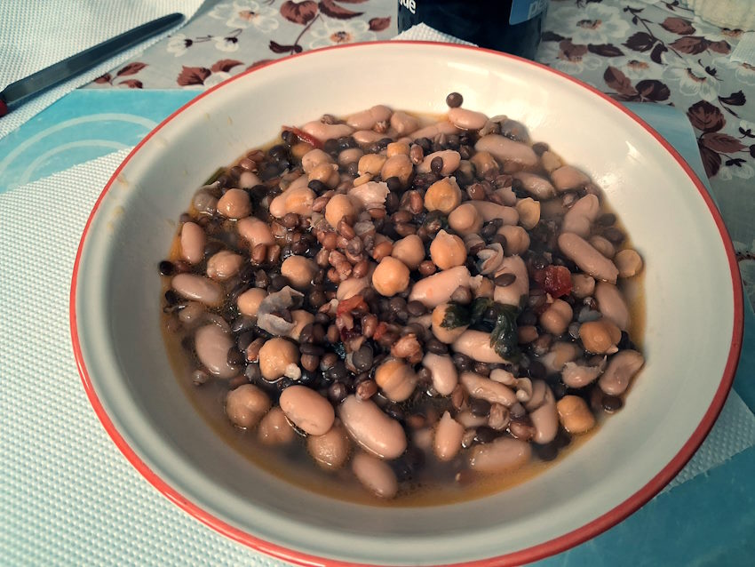 Questo piatto, un tempo molto in voga, è un sapiente intreccio di sapori e tradizioni. Si tratta di un mix di legumi e cereali che include fagioli quarantini e borlotti paesani, ceci, lenticchie, cicerchie e farro. È una pietanza ricca di proteine vegetali che i nostri antenati portavano spesso in tavola: un pasto povero negli ingredienti, ma nobilissimo nei nutrienti. Per gustarlo al meglio, basta pochissimo... Prima di tutto cuocerli a fuoco lentissimo " Dint a lu Pignatieddr" un pizzico di sale e un filo di olio EVO a crudo prima di servire. Buon appetito! |
